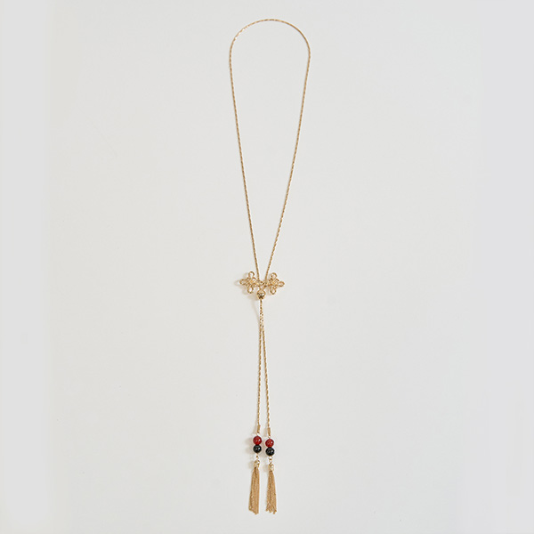 2025年11月受注受付|2026年4月下旬 より順次登場 ネックレス ¥3,300 「らんま1/2」をイメージしたネックレス。 ゴールドのチャイナボタンが重なり合ったデザインのモチーフがポイント。 球体部分には天然石の使用しております。 その下には金属のタッセルがそれぞれぶら下がっており動くたびに揺れる仕様です。 ※天然石のため1つ1つ色みや模様に個体差がございます。 発売元:株式会社ストライプインターナショナル 主な取扱店:ECサイト「STRIPE CLUB」 詳しくはこちら