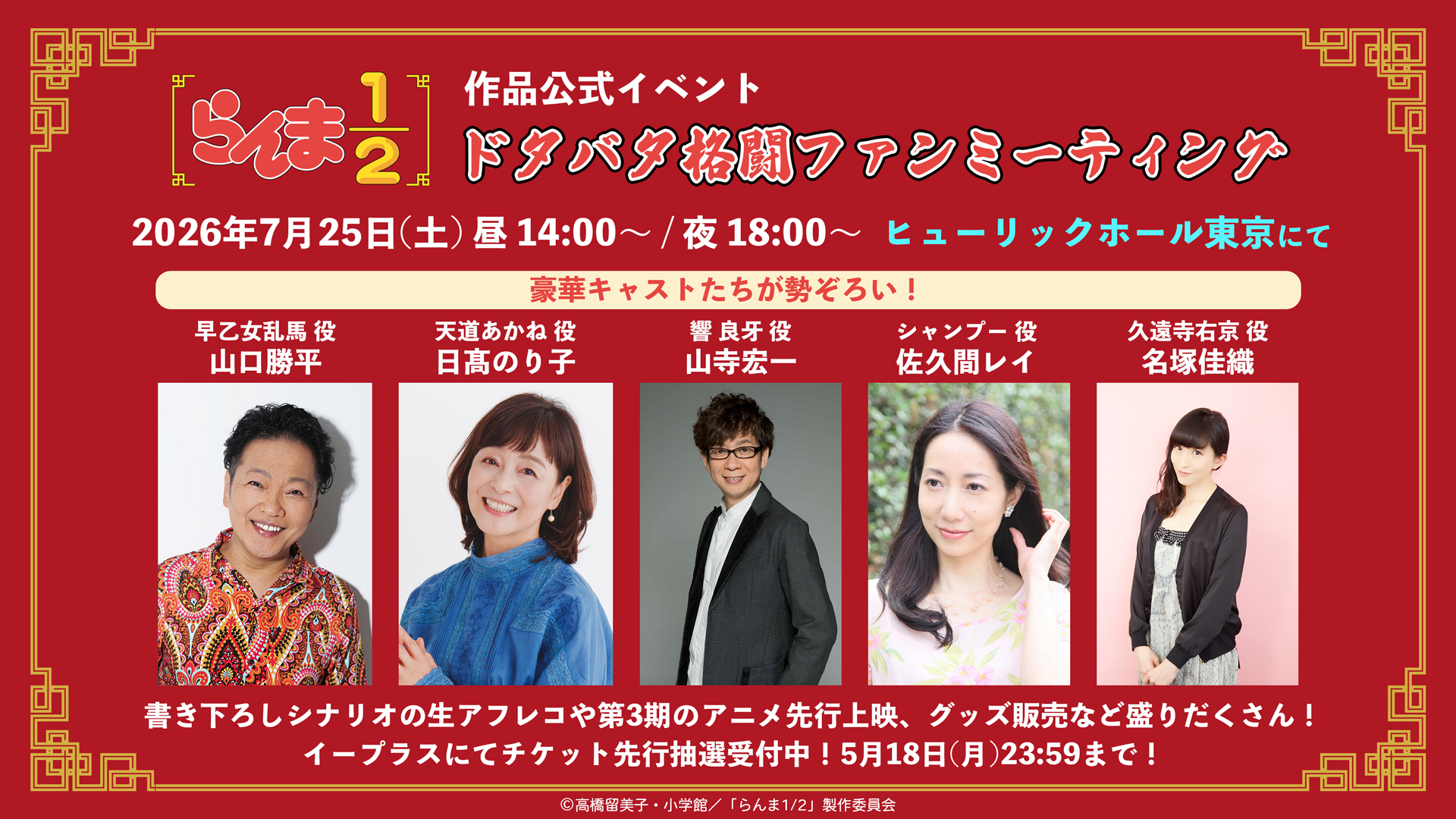 乱馬役・山口勝平さん、あかね役・日髙のり子さん、良牙役・山寺宏一さん、シャンプー役・佐久間レイさん、右京役・名塚佳織さんら豪華キャストが出演!